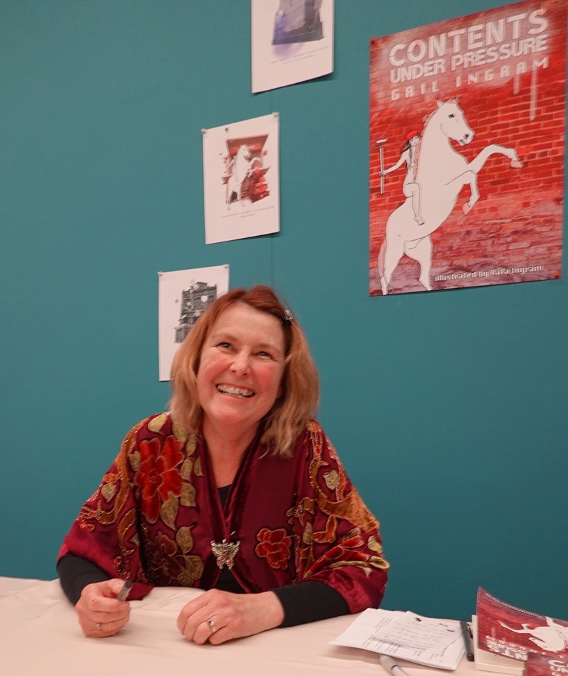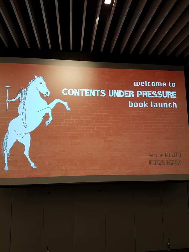 Welcome to my book launch, 5.30pm April 30th in the Spark Room at Tūranga Central Library Christchurch. Rata Ingram my amazing daughter not only designed the cover of my book and did the illustrations, she made a terrific PowerPoint to introduce the order of events. Unfortunately Rata was literally struck down by an ear infection as we set up the room. She lay down on the floor as the show began, unable to even lift her head. I thought I might join her. This was crazy. After writing poetry for ten years, my first collection was being launched, Contents Under Pressure, and what pressure it was. How would the book stand up under scrutiny? How would the launch go? But there was so much to do and happen, I had to perform.